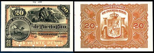 San Juan, Puerto Rico, ND (1889), 20 Pesos, P-10p, Unlisted Specimen, Series A, S/N 00000, Black on orange and yellow underprint, Paschal lamb on left, dock workers moving crate on top right, back orange-brown with arms in middle, POC's, The face is PMG graded Gem Uncirculated 66 EPQ, the back is Choice Uncirculated 64 NET with notation of discoloration due to the oxidation of the orange color to orange-brown, otherwise an extremely attractive and rare note missing from most advanced collections. ABNC. This is the only graded example by PMG.