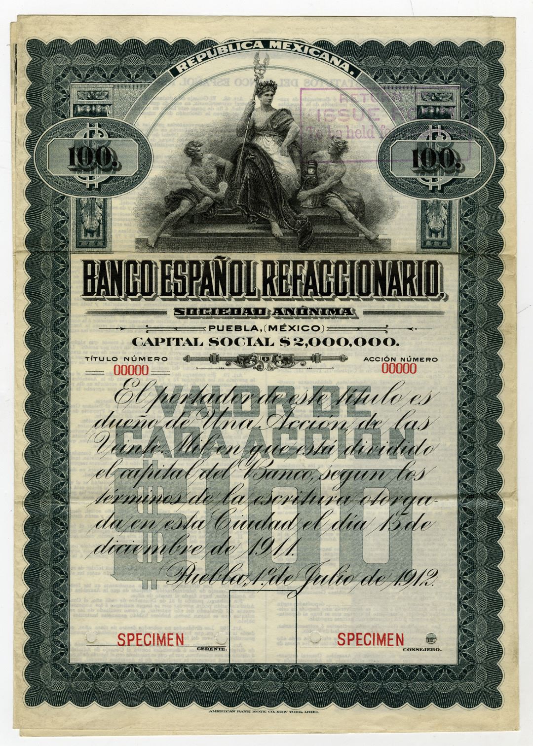 Mexico. 100 Pesos = 1 Share, Specimen Share Certificate with dividend coupons, Black print on blue border and under tint printed in Spanish, Group of allegorical figures together at top, Specimen overprints and POC's, VF-XF condition, ABNC.