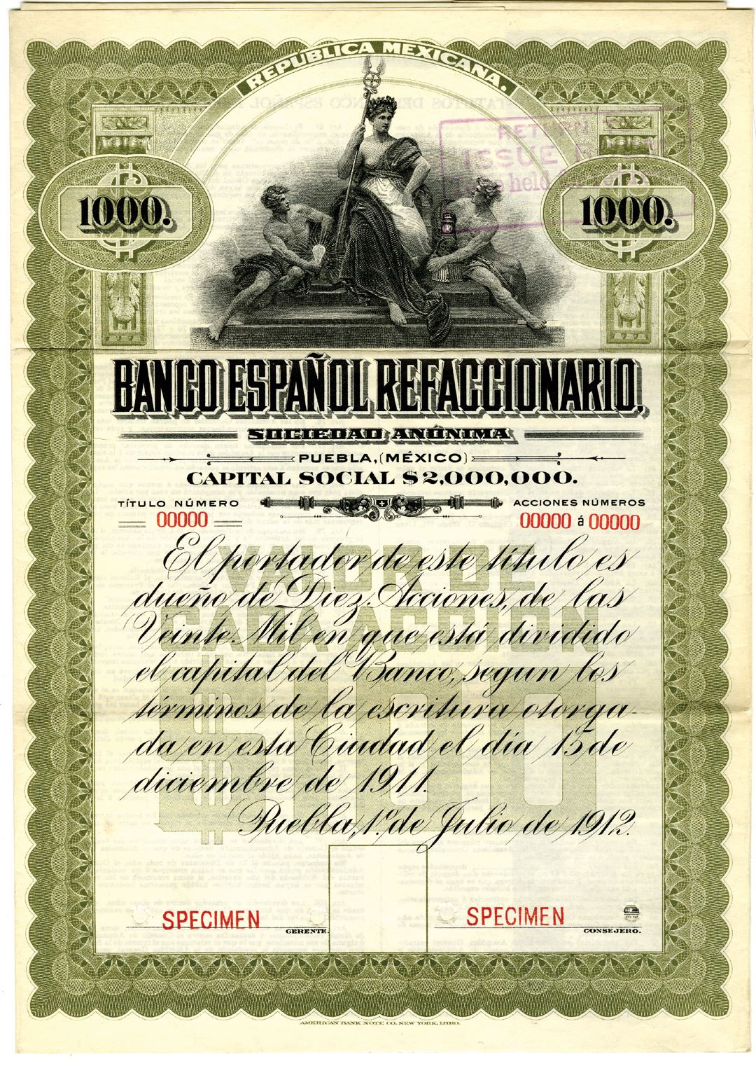 Mexico, 1912. 10 Shares worth $1000 Specimen Stock Certificate with Coupons, Black text with olive border and underprint, Trio of allegorical figures at top center. Red specimen overprints, 00000 serial numbers, and POCs. VF condition, ABNC.