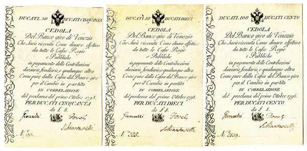Italy, 1798, Lot of 3 notes, includes 10 Ducati, P-S181; 50 Ducati, P-S182,and 100 Ducati, P-S183, all are issued and Choice AU to CU condition, Attractive trio of early Italian notes.
