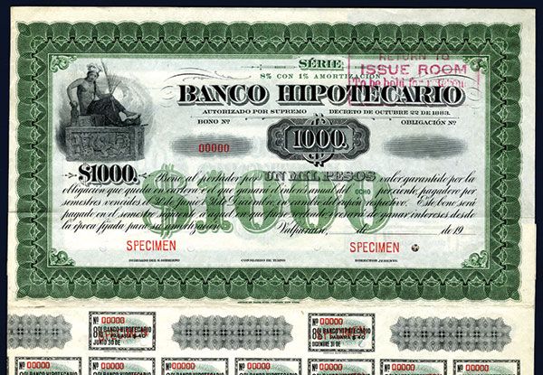 Valparaiso, Chile, 19xx. (ca.1900-1920), 1000 Pesos, Series 8%- 1%, Green border and underprint with indian on left, coupons attached, Specimen overprints, POC's, VF, scarce Chilean bond. ABNC.