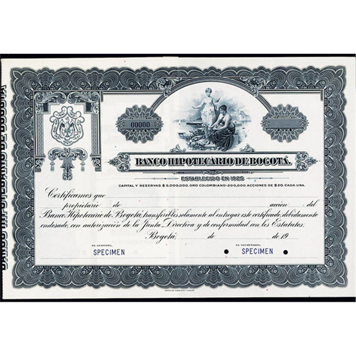 Bogota, Colombia, 19xx (ca. 1920-30's), Odd Shares (Acciones), Gray border with allegorical topless woman with steamship in background, Specimen, POC, Arms on left . XF with archival folds as made. ABNC. Scarce Colombia bank certificate.