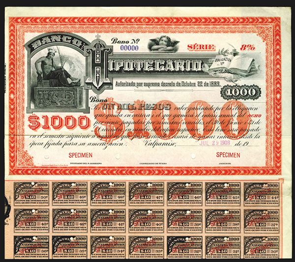 Valparaiso, Chile. 19xx (ca.1908). 1000 Pesos, Specimen bond. 8%. Black on Red border. Seated Native Indian on left, Cherub on top, Red specimen overprints, "00000" serial numbers and POC's. Coupons attached. Fine to XF condition. ABNC.
