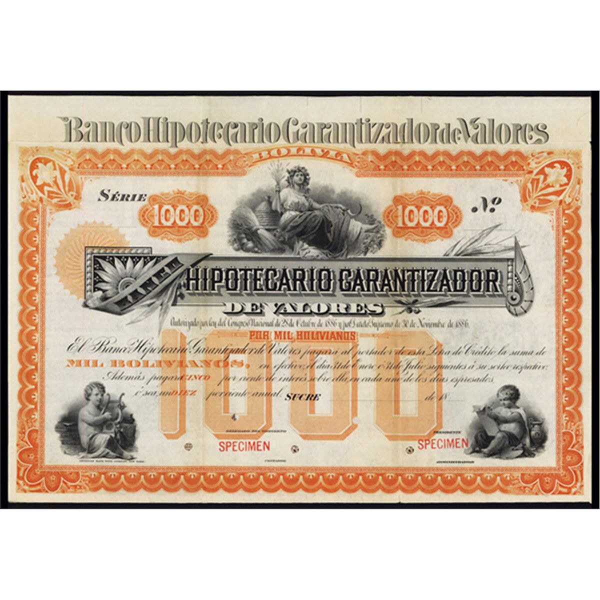 Bolivia, Sucre, 1886, 1000 Bolivianos, Specimen bond, Woman reclines near beehive, cherubs below, Orange, ABNC, POC's, XF. Coupons attached. ABNC.