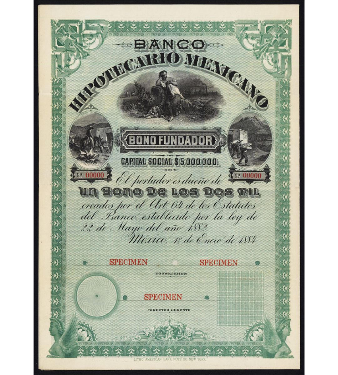 Mexico, 1884, Specimen "Bono Fundador". Green border and undertint. Allegorical woman with cornucopia on top flanked by men working on the left and right. XF condition. Rare Mexican bond. ABNC.