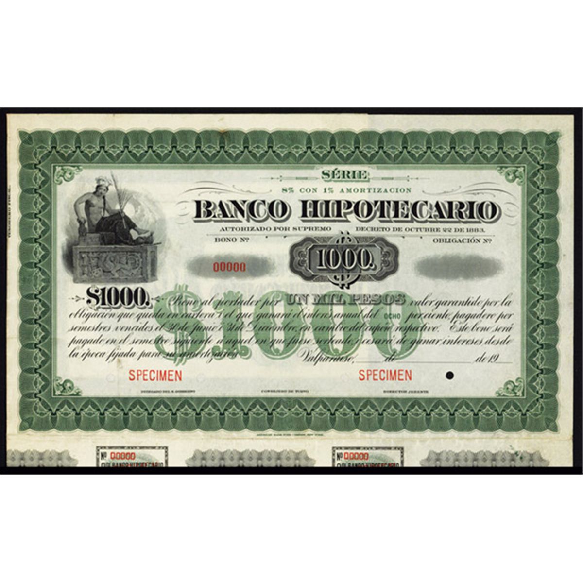 Valparaiso, Chile, 19xx (ca.1900-1920), $1,000, Series 8%, Green border with female Native American on left, ABNCo. Specimen with coupons, VF condition.