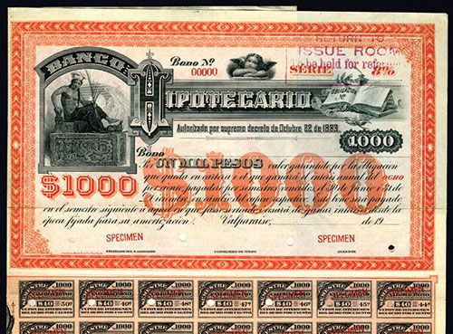 Chile, 19xx. (ca.1900-1920), 1000 Pesos, 8% Specimen Bond, Black on orange border and underprint, Native South American top left with Raphael's angel top center, Coupons attached, Specimen overprints, POC's, VF-XF, scarce Chilean bonds. ABNC.