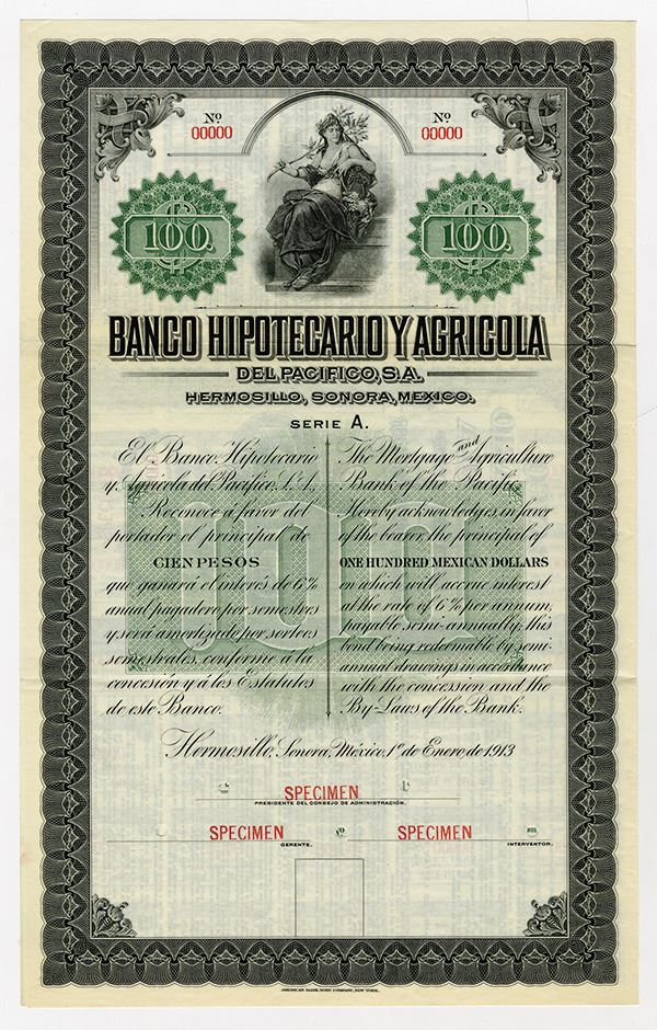 Hermosillo, Sonora, Mexico. Specimen 100 Mexican Dollars Ser. A, 6% Silver Coupon Bond. Black border and green undertint. Vignette of seated allegorical woman with plants . Coupons attached. Red specimen overprint. XF condition. ABNC. Scarce bond.