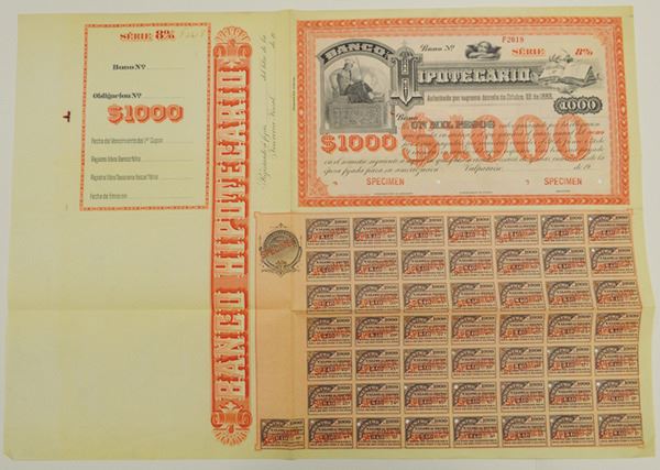Chile. $1000 Specimen 8% Coupon Bond, Black print on red/orange border and under tint, Allegorical woman at top left corner next to company title, Specimen overprints and POC's, VF-XF condition, ABNC.
