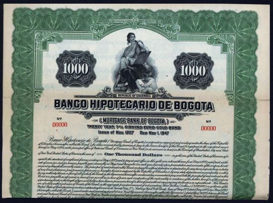 Colombia, 1927, $1000, 20 Year 7% Sinking Fund Gold Specimen Bond, Coupons attached, Black on green border and underprint, Red SPECIMEN overprints POC's and red s/n Ò00000Ó, VF condition with creases where bond was once folded, ABNC.