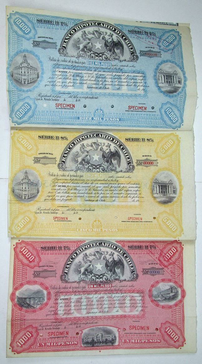 Santiago, Chile, ND (1910-1920). Lot of 3 Series B Specimen Bonds, Includes: 1000 Pesos 7% Coupon Bond; 5000 Pesos 8% Coupon Bond; and, 10,000 Pesos 7% Coupon Bond. All have the same vignettes - Seal of Chile at top and bridges to left and right, All are in VF condition, all have Specimen overprints and POCs, and all were printed by ABNC. (3). Sold "AS IS" no returns accepted.