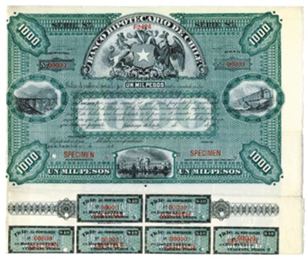 Chile. 1000 Pesos Specimen 8% Coupon Bond, Black print on green border and under tint, State seal of Chile at top with images of train tracks/bridges at either side of certificate, Specimen overprints and POC's, Fine condition with toning over certificate, ABNC.