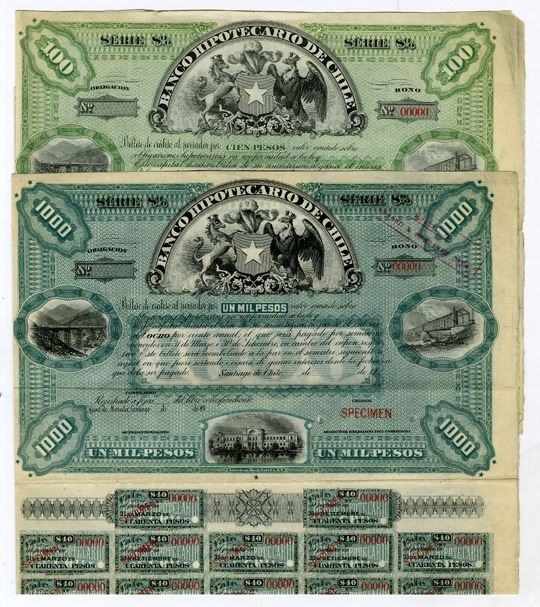 Santiago, Chile, ca. 1900-30s. Lot of 2 Specimen 8% Coupon Bonds in Spanish: 100 Pesos in light green; and 1000 Pesos in green. Both have red specimen overprints, 00000 serial numbers, and POCs. VF condition. ABNC. (2)