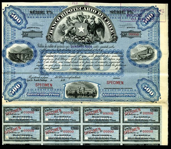 Banco Hipotecario de Chile, ca.1900 Specimen Bond. Santiago, Chile, $100 bond, specimen, Serie 8%, blue border and underprint with Chile Arms in middle top with bridges on left and right and bank building on bottom, specimen overprints, POCs, coupons attached, ABNC, XF condition.