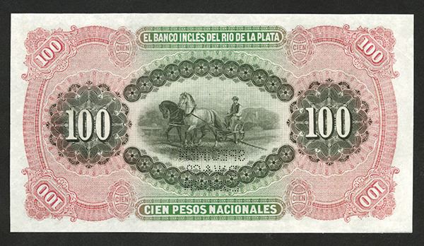 Uruguay. 100 Pesos. P-S194 Specimen. Unlisted as such. Female standing with shield at left, farm animals around center design. Specimen. BWC perforation at center. Uncirculated to CU condition. BWC.