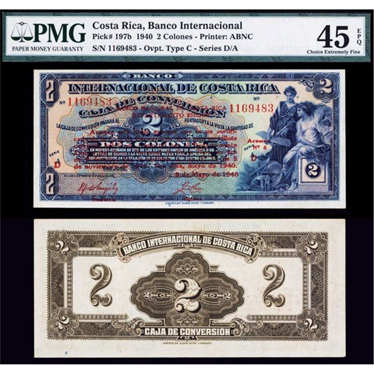 San Jose, Costa Rica, 1940, 2 Colones, P-197b, Issued, S/N 1169483 - Overprint Type C - Series D/A, Blue on m/c, allegorical women on right, red overprint in middle of note, back brown, PMG graded Choice Extremely Fine 45 EPQ (Exceptional Paper Quality), slight mishandling of the note corners has kept this lovely note from AU to Uncirculated condition. ABNC.