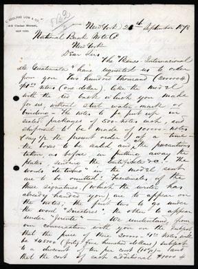 New York, NY, September 20th, 1878. 2 page letter on the letter head and from C.Adolphe Low & Co., 42 Cedar Street, New York (agents for Banco Internacional De Guatemala) to National Bank Note Company. The letter relates to the first NBNC banknote printing job for the bank, the 1879, 1 Peso, P-S151 banknote. This note was printed by ABNC after they took over NBNC in the late 1870's to early 1880's. The letter states that the bank had requested Adolphe Low & Co. " to order from you (NBNC) (200,000) $1.00 (one-dollar) like the model with the red back which you made for us ......in sealed packages of 500 notes each.....The word "de turno" in the model sent are to be omitted......the price of these 200,000 - $1.00 notes will be $4,500 subject to a discount of 10%". The leter mentions other details that the bank would like as well as pricing and seals. The letter is signed C.Adolphe Low & Co by secretarial signature but initialed by Adolphe Low on the lower left back page. Unique and historic letter referring to the very first National Bank Note Company banknote printing job for this well known Guatemala private bank. NBNC.