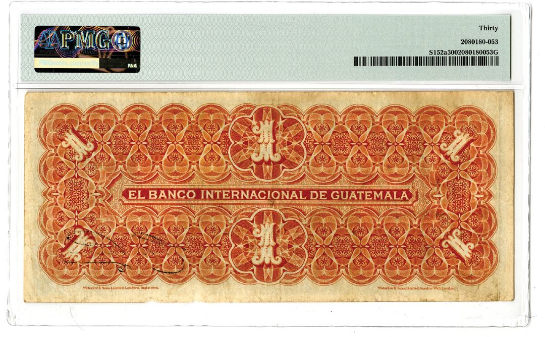 Guatemala, 30th June, 1900. Banco Internacional de Guatemala 1 Peso, Serie 2, P-S152a, Issued Banknote. Black, with hand holding eight flags at center. Hand stamped or signed signature at right, 3 printed signatures at left, S/N 669263, Printer: W&S. PMG graded Very Fine 30. Only 2 notes have been graded in the PMG census.