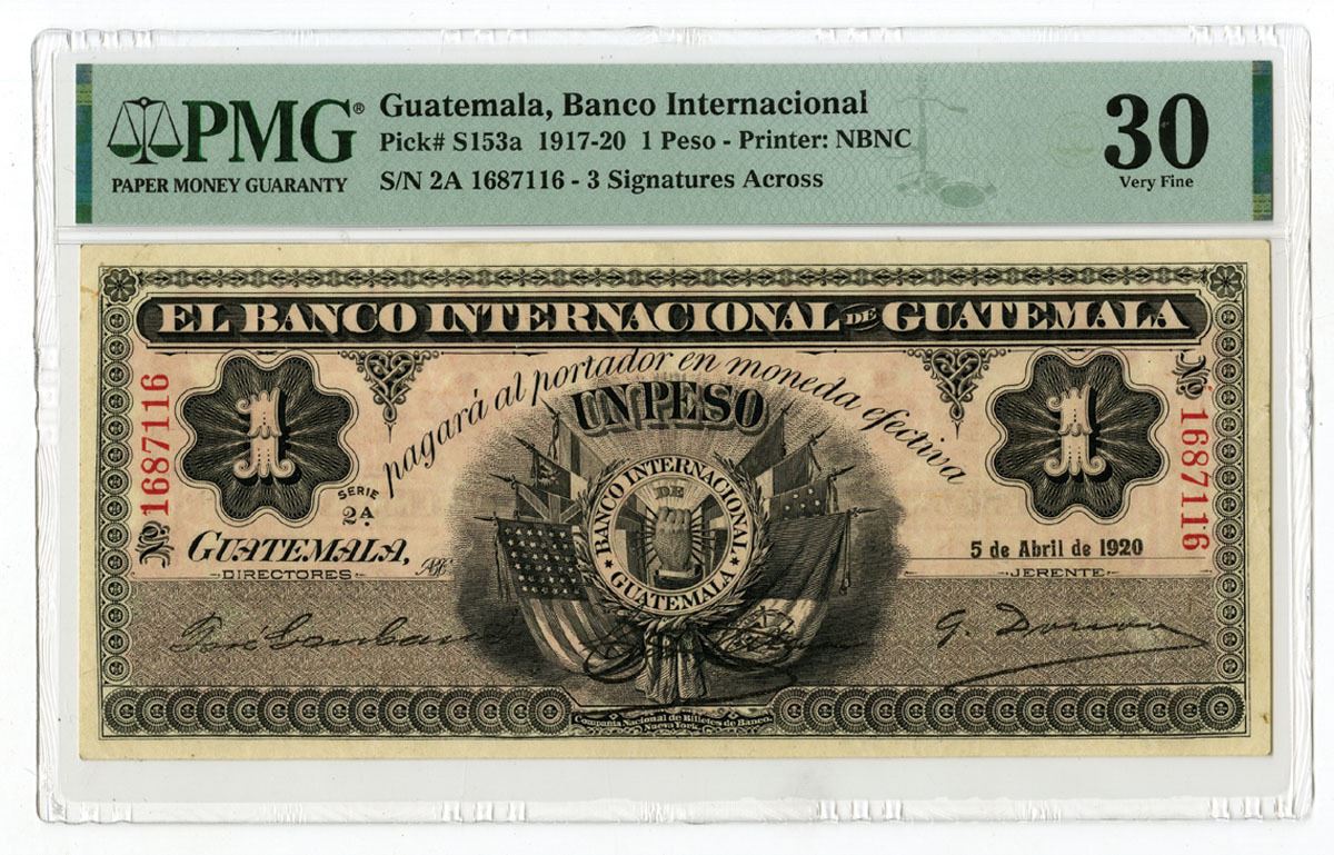 Guatemala, 1920. 1 Peso, P-S153a, Issued banknote, Black printing with hand holding eight flags at center, Back is red/orange with bank title at center, 3 signatures across, S/N 2A 1687116, PMG Graded Very Fine 30 , NBNC.