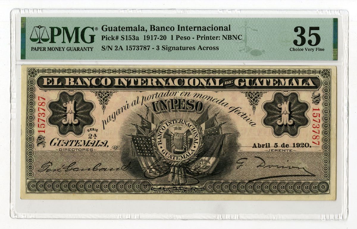 Guatemala, 1920. 1 Peso, P-S153a, Issued Banknote, Black printing with hand holding eight flags at center, Back is red/orange with bank title at center, 3 signatures across, S/N 2A 1573787, PMG graded Choice Very Fine 35 , NBNC.
