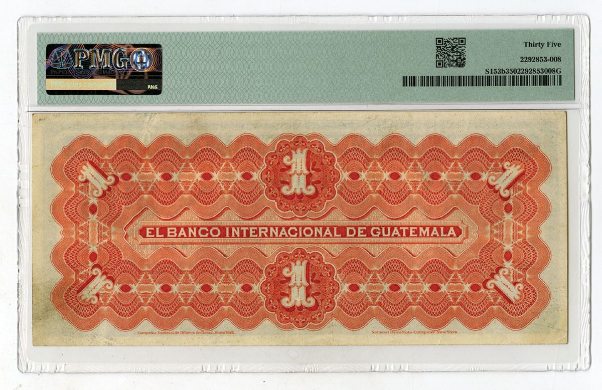 Guatemala, 1923. 1 Peso, P-S153b, Issued Banknote, Black printing with Arms of Guatemala at center, Back is bright orange with Bank title at center, S/N 2A 1830211, PMG graded Choice Very Fine 35, NBNC.