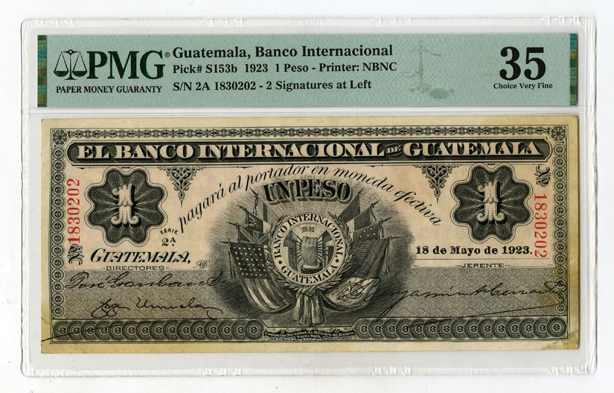 Guatemala, 1923. 1 Peso, P-S153b, Issued Banknote, Black printing with hand holding eight flags at center, Back is red-orange with bank name at center, S/N 2A 1830202, PMG graded Choice Very Fine 35 with comment "Stains," NBNC.