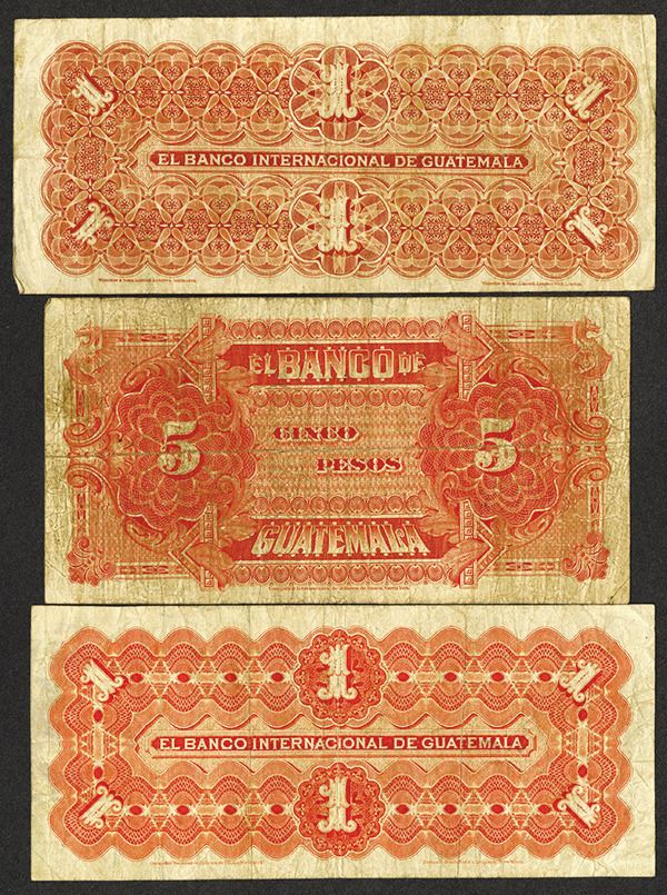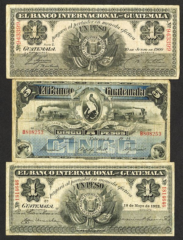 Guatemala. 1915, 5 Pesos, P-S143c, IBNC; 1 Pesos, P-S152a (W&S); P-S153b (NBNC). Nice Fine or a bit better. 3 pieces.
