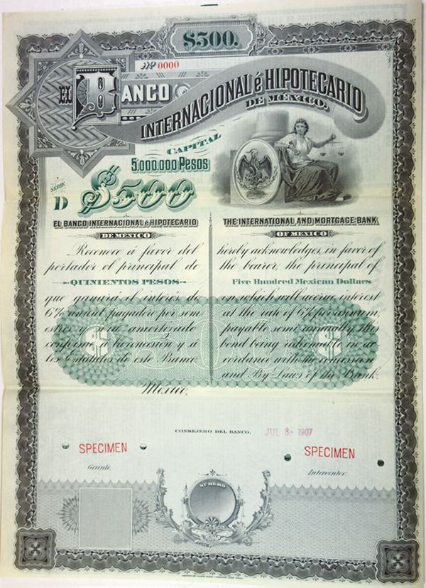 Mexico. 500 Pesos Specimen Seres D Coupon Bond, Black print on black border with green undertint printed in English and Spanish, Vignette of seated justice with arms of Mexico under ornate title. Specimen overprints and POC's, Fine-VF condition with toning around margins. ABNC. Scarce Note.