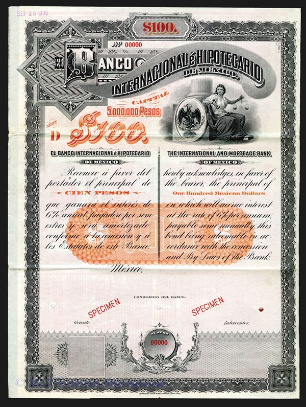 Mexico, ND (ca.1906). 100 Pesos. Black border and orange undertint. Vignette of seated justice with arms of Mexico under ornate title. Coupons attached. Red specimen overprint. XF condition. ABNC. Scarce.