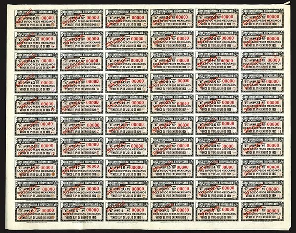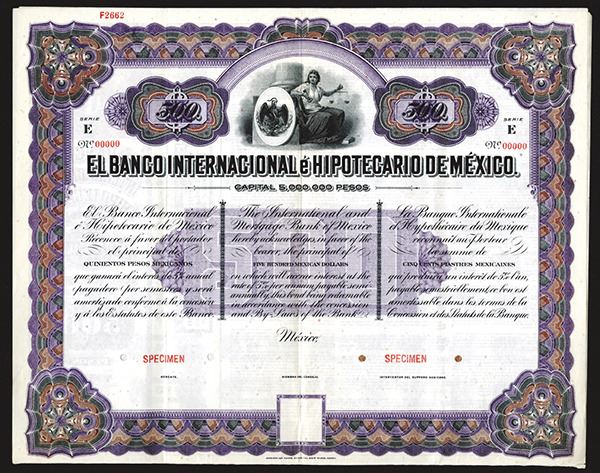 Mexico, ND (ca.1906). 100 Pesos. Black border and orange undertint. Vignette of seated justice with arms of Mexico under ornate title. Coupons attached. Red specimen overprint. XF condition. ABNC. Scarce.