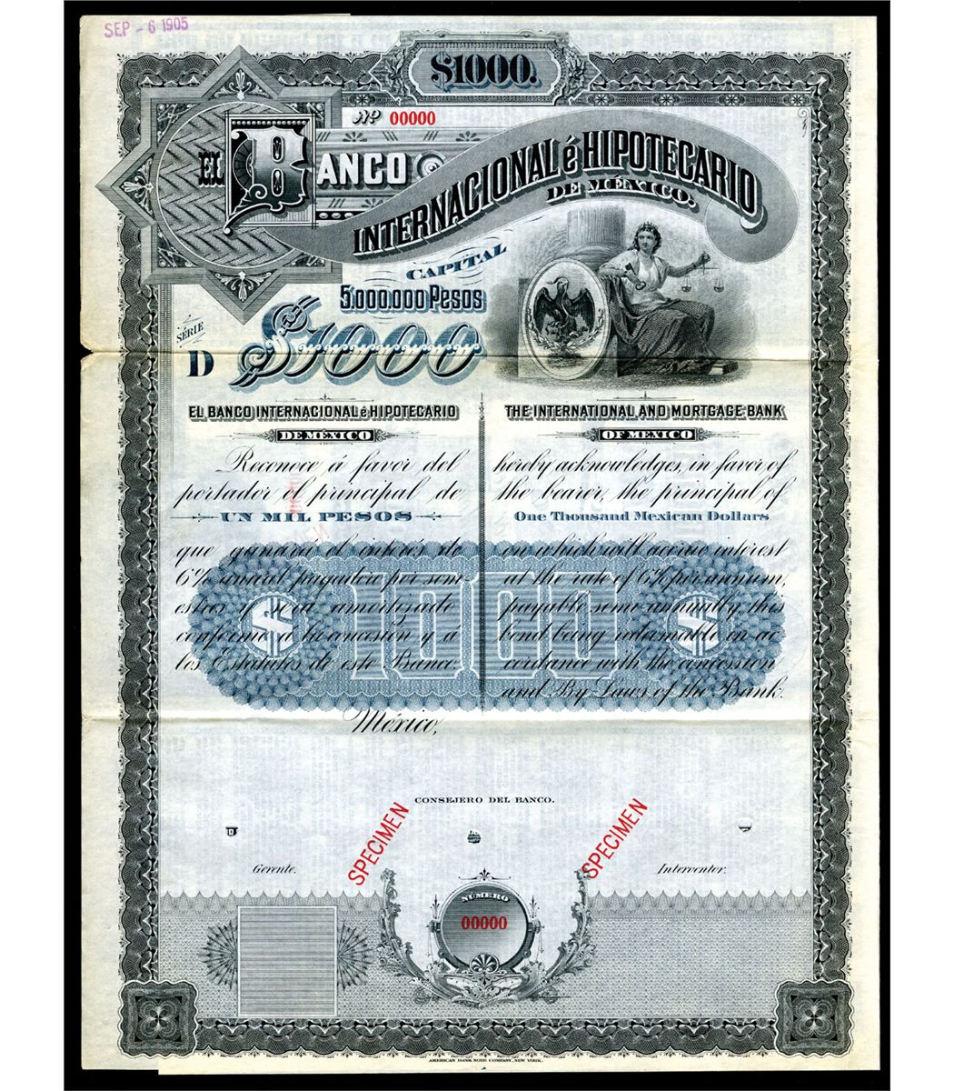 Mexico, ND (ca.1905). Specimen bond. 1000 Mexican Dollars. Serie D, Black border and blue undertint. Vignette of seated justice with arms of Mexico. Coupons attached. VF condition. ABNC.