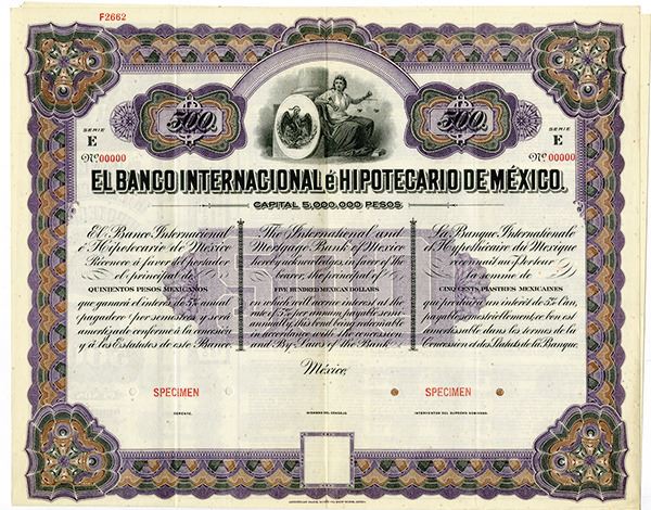 Mexico. 500 Pesos Specimen 5% Bond. Black print on purple, tan and green with purple undertint. Vignette of seated justice with arms of Mexico. Coupons attached. VF-XF condition. ABNC.