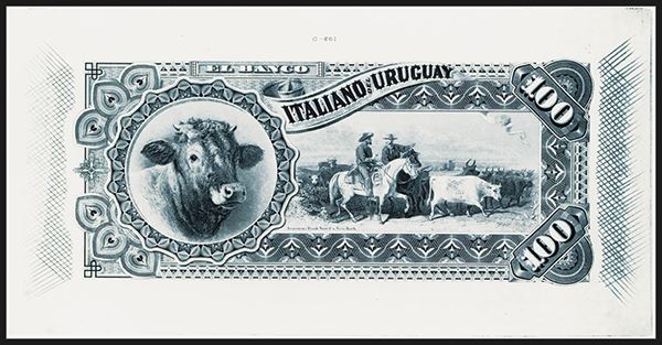 Montevideo, Uruguay, 1887 (Proprietary proof reprinted by ABNC in the 1970's). 100 Pesos, P-S214p Unlisted. Black on large white card, cow at left with vaqueros and cows on right, Choice Uncirculated, Rare note in any format. ABNC.