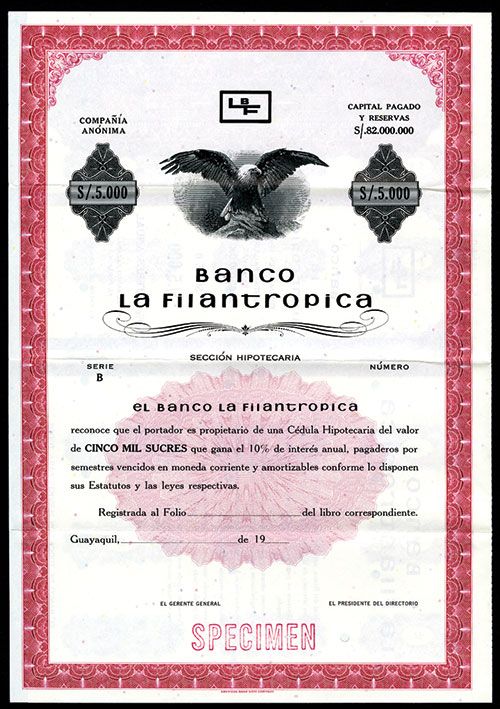 Ecuador, 19xx, 5000 Sucres, 10% Specimen bond, Black on red border and underprint, Bald Eagle with wings out top center and company logo above it, VF-XF condition, ABNC.