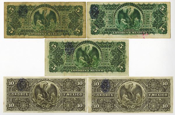 Mexico. Lot of 5 notes, Includes 5 Pesos (3) and 10 Pesos (2), P-S233b, d; and P-S234e. VG to XF condition. ABNC. Attractive series of notes.