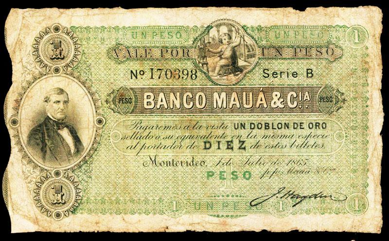 Banco Mauá & Ca., 1865 Issue Banknote.Montevideo, Uruguay, 1865, 1 Peso, Ser.B, P-S273, Issued banknote, Black on green underprint, S/N 170398, VG to Fine condition, Scarce note. BW&C.