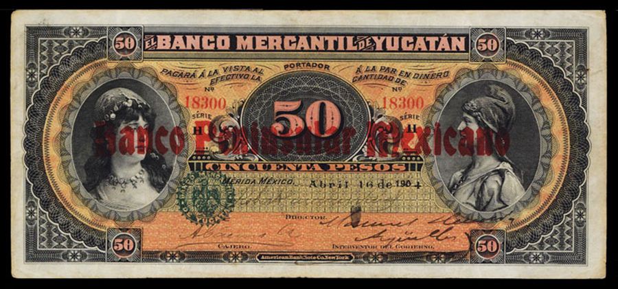 Merida, Mexico, April 16, 1904, 50 Pesos, P-S461, M557, with overprint on P-S456, Banco Mercantil De Yucatan, Issued Banknote, Black on red underprint with additional overprint in red BANCO PENINSULAR MEXICANO in middle, S/N 18300, Green Bank seal, Liberty on right and young women on left. PMG graded Very Fine 25, Pinholes (3 or 4 that are difficult to see or even find on the note), Exceptional note that is rarely seen in any condition and this is a conservatively graded Very Fine with large even margins, crisp firm paper and with claims to Choice VF status. ABNC.