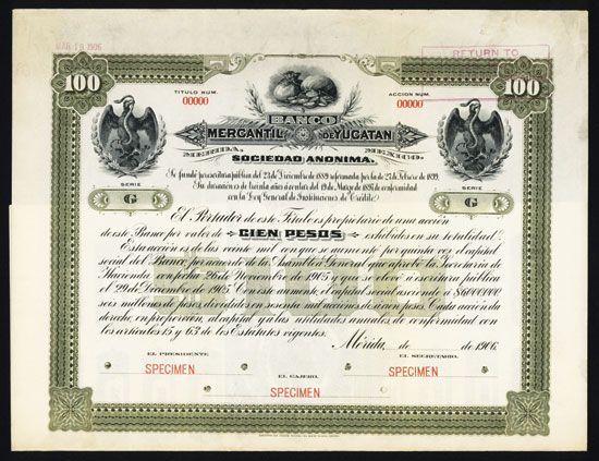 Mexico, 1906, 100 Pesos, Series G Bond, Specimen Bond, Coupons attached, Black on brown border and underprint, Two bags of coins top center with hawk with snake in beak flanking companies name, Red SPECIMEN overprints POC's and red s/n Ò00000Ó, VF-XF condition, ABNC.
