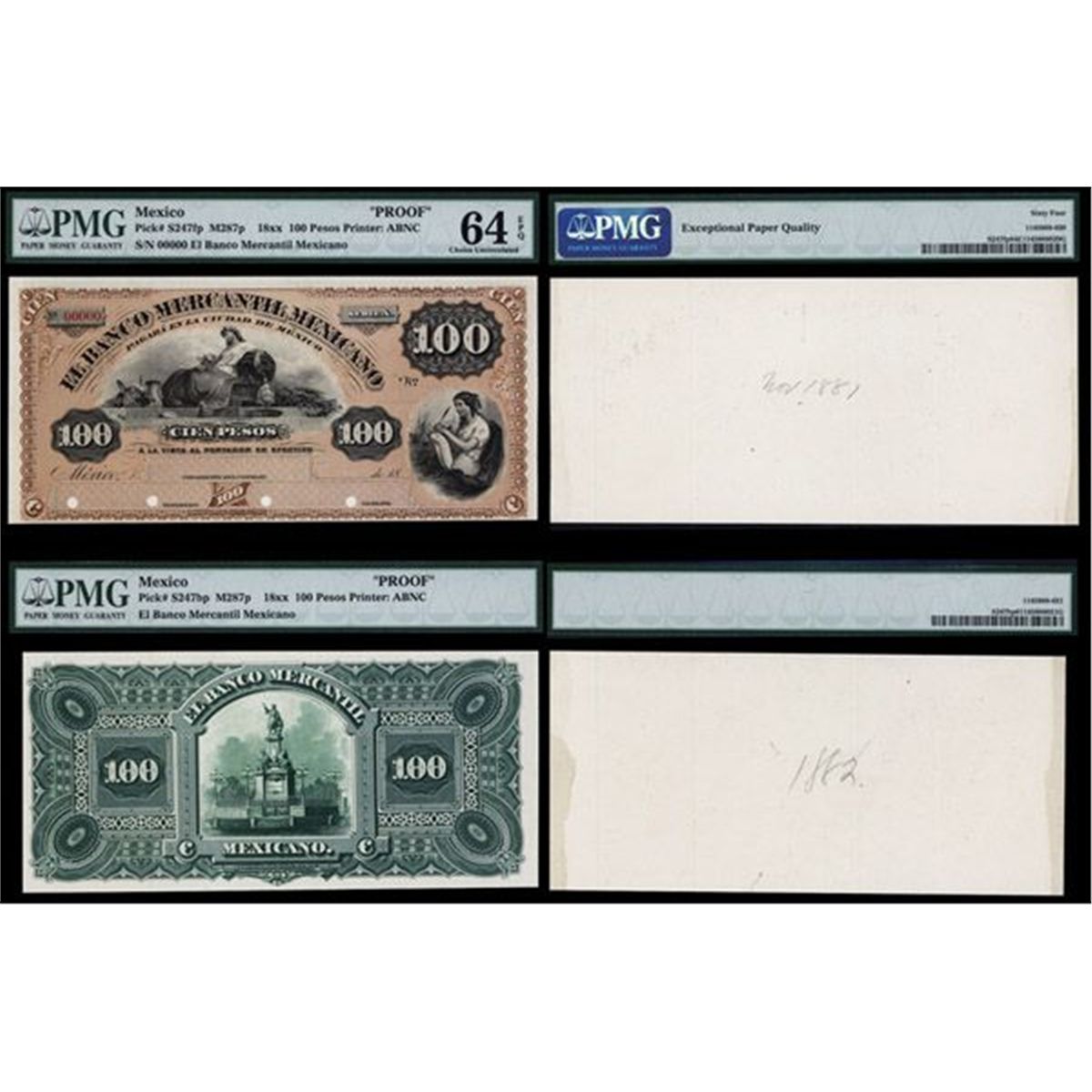 Mexico, 18xx (ca.1882), 100 Pesos, Series A, P-S247fp and P-S247bp, M287p, Proof banknote, printed on india paper on cut down card, black on brown underprint, Reclining allegorical woman “L'Orient” on left-center and seated allegorical woman writing “Trade” on lower right, back green with monument to Christopher Columbus. PMG graded Choice Uncirculated 64 EPQ, (Exceptional Paper Quality), POC's, Extremely rare note in any format or condition. A trophy for any collector of Mexican banknotes, ABNC.