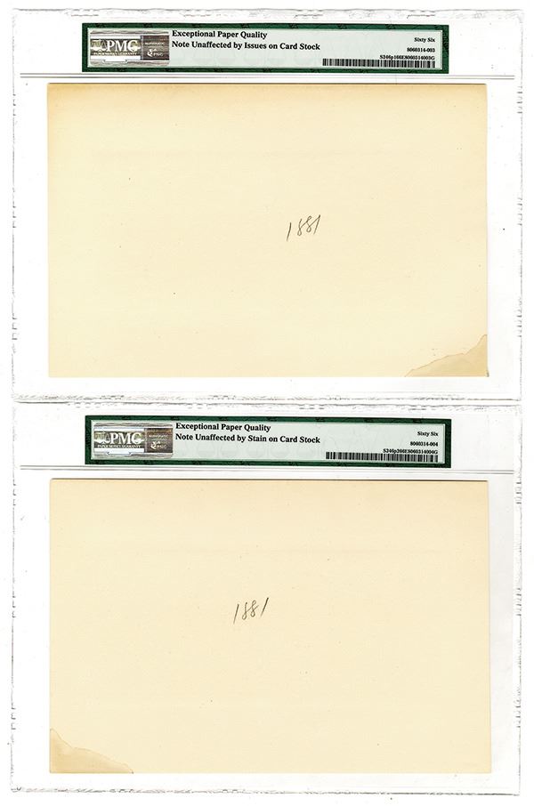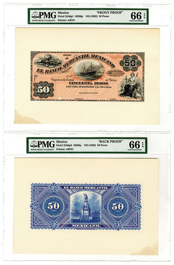 Mexico... 1882, 50 Pesos, Series A, P-S246p1 and p2, M286p, Face and Back Proofs printed on india paper on large card. Farm equipment, sheaves and tools on top left, steamship in middle and seated allegorical woman with child on right. The face and back are PMG graded Gem uncirculated 66 EPQ with stain on the lower left corner far from the design. POC. ABNC. Extremely rare and attractive Mexican Banknote. Unlisted and unpriced as issued, only as proof and specimens.