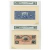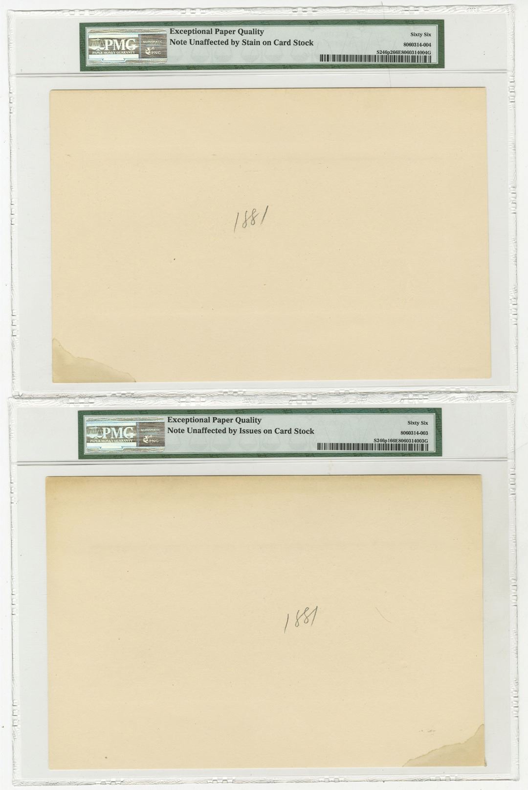 Mexico, ND (1882). 50 Pesos, P-S246p1 and p2, M286p, Face and Back Proofs printed on india paper on large card. Farm equipment, sheaves and tools on top left, steamship in middle and seated allegorical woman with child on right. The face and back are PMG graded Gem Uncirculated 66 EPQ with notation "note unaffected by stain on card stock." POC on face only. ABNC. Extremely rare and attractive Mexican Banknote. Unlisted and unpriced as issued, only as proof and specimens. This is the highest graded pair by far of the 2 pairs graded in the PMG census.