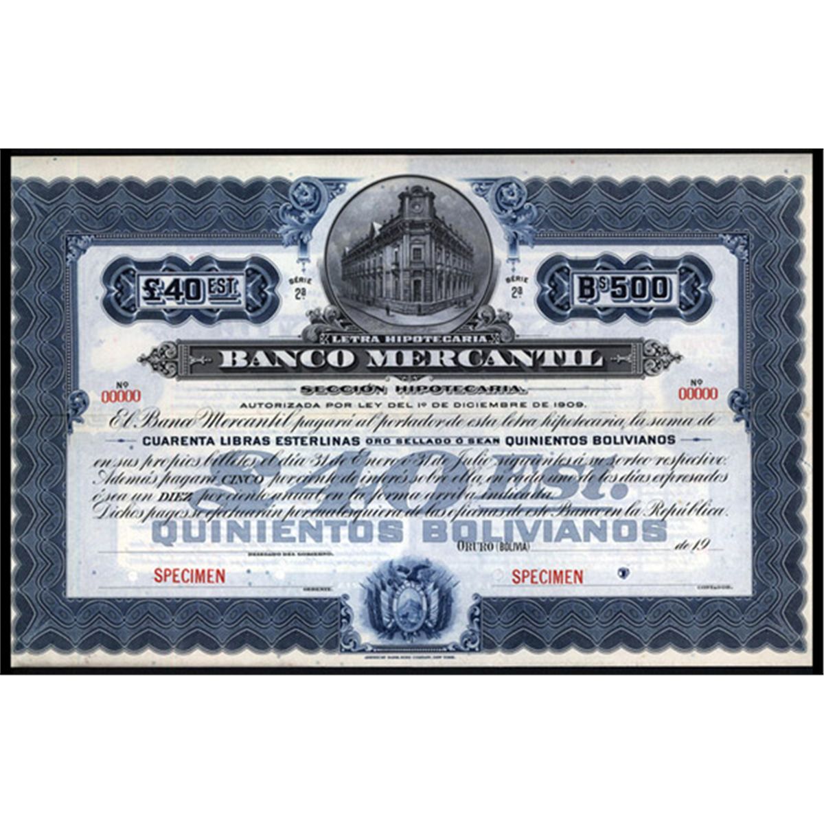 Bolivia, 19xx (ca.1900-20), 500 Bolivianos, Specimen Bond, Black on dark blue border and underprint, Vignette of bank top center, Coupons attached, VF-XF condition, ABNC.