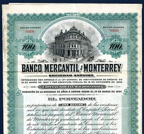 Mexico, 1907, $100, Specimen Bond, Black on green border and underprint, Vignette of bank building top center, POC's, VF condition with some wear around the edges, ABNC.
