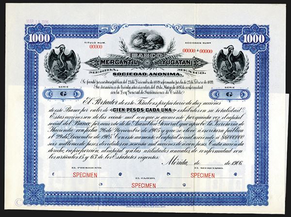 Merida, Mexico. 1000 Pesos. Series G. Blue border and undertint with black vignette. Vignette of bags of coins flanked by Arms of Mexico. Coupons attached. XF condition. ABNC. Rare bond.
