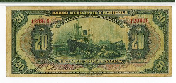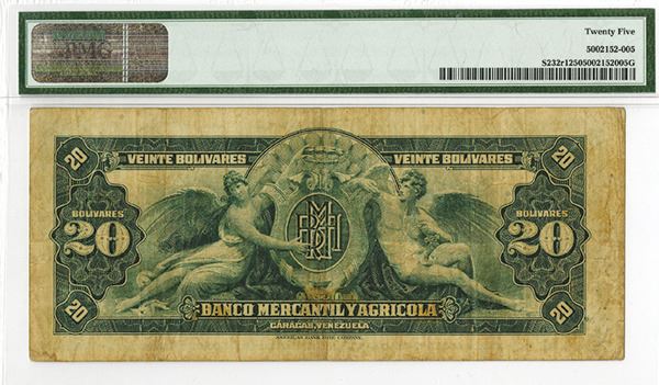 Caracas, Venezuela. 20 Bolivares, P-S232r1, Appears issued but the PMG holder states Remainder - 2 signatures, possibly signed to be passed off as a current note, Green on m/c, S/N 120919, PMG graded Very Fine 25, Attractive and scarce note. ABNC.