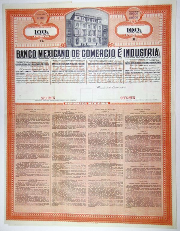 Mexico, 100 Pesos = 1 Share, Specimen, Black on orange border and underprint, bank building on top, Dividend coupons attached, Specimen overprints, POC's, XF to uncirculated with folds as made. ABNC. Rare with only 2 certificates found.