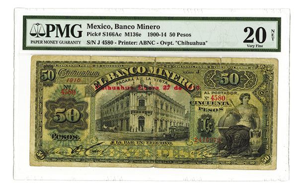 Mexico, issued 50 Pesos, 1910, P-S166Ac, M136e, overprinted "Chihuahua", graded Very Fine 20 by PMG with a remark of "tears". ABNC.