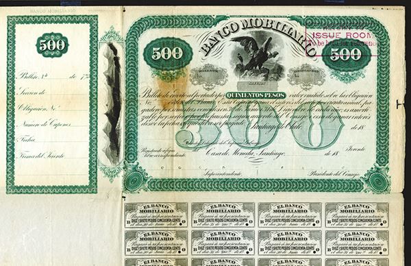 Casade Moneda, Santiago, Chile. 18xx (ca.1870-80's). 500 Pesos, P-Unlisted "Billete de Credito", Black vignette and title with green border and undertint, Condor with spread wings vignette in middle and mountain scene on left. "Return to Issue Room" purple hand stamp on UR with small POC's in signature blocks, coupons attached. Fine condition with minor splits at folds, light toning and one 1 x 1.5 inch area internal light stain located on the left middle of the note. This bank has relatively few if any collectible banknotes that are available to the collecting community, with most issues listed being unpriced or listed as rare. An infrequent opportunity to own a piece of financial history from this rare bank. ABNC.