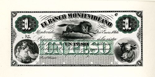 Montevideo, Uruguay, 1866, 1 Peso, P-S353 Unlisted proof, Printed on india paper mounted on large card, Black on green and m/c, Extremely rare as proof. Choice to Gem Uncirculated. ABNC.