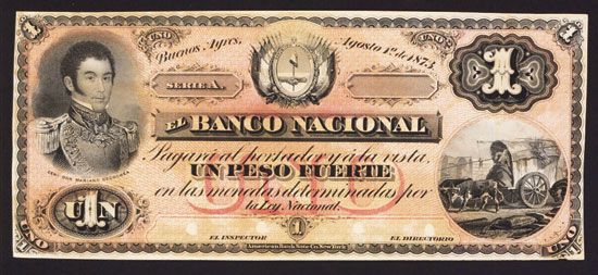 Buenos Aires, Argentina, August 1st, 1873, 1 Peso Fuerte, P-S649p, Proof face only, no back, Printed on india paper on thin card cut down to banknote size, Black on salmon underprint, General Necochea on left, ox cart right, arms center top, POC's, AU condition, rare note in any condition, ABNC.